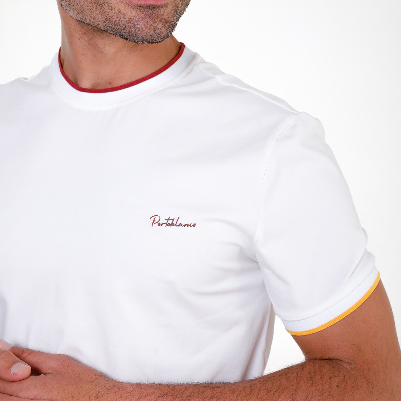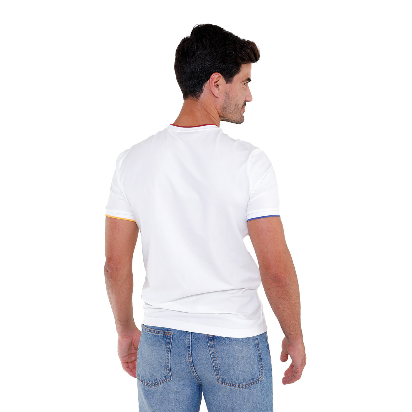 Un básico con actitud. Esta playera blanca eleva el estilo casual con un diseño que resalta por sus detalles multicolor inspirados en la energía contemporánea.